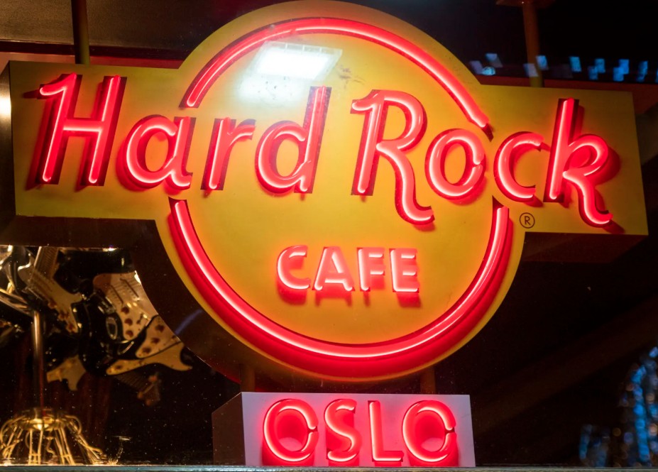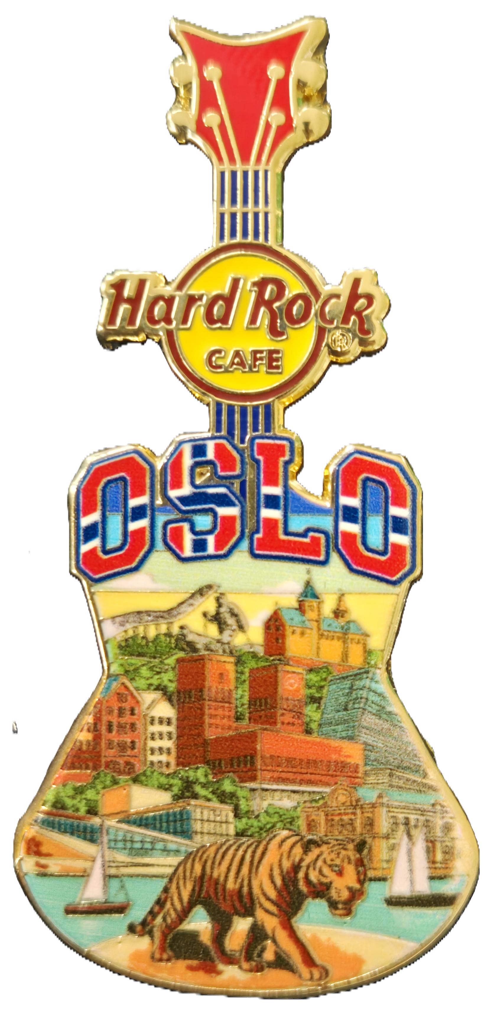 4linjers tekst, Hard Rock logo og diagonale gitarer, Antikk Gullvalør |