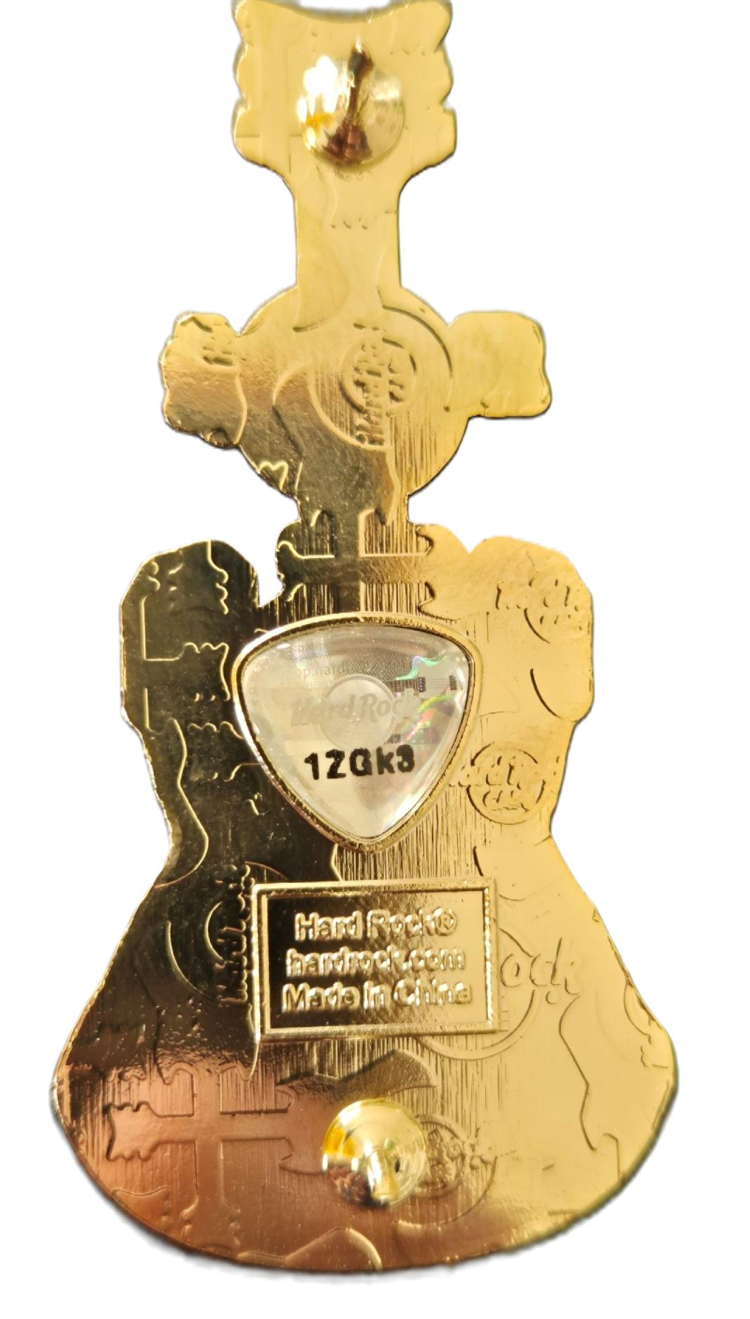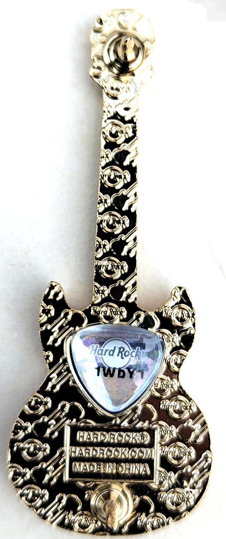 3linjers tekst, Hard Rock logo og diagonale gitarer, Gullvalør |